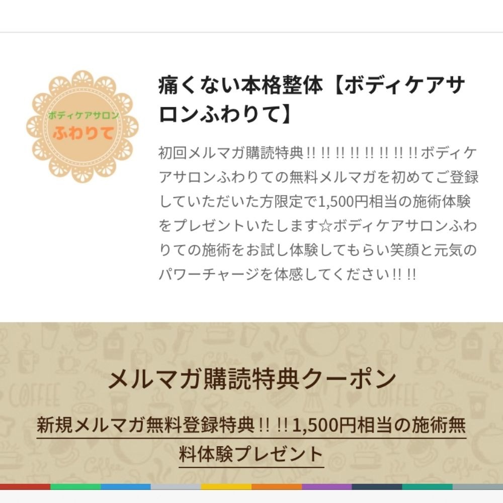 【ボディケアサロンふわりて】の《購読してクーポンGET》を押して無料クーポンGET